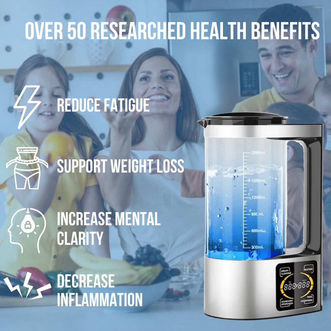 Improve your daily hydration routine with hydrogen-infused water: a miraculous antioxidant backed by over 1400 published studies showcasing its multitude of health benefits.